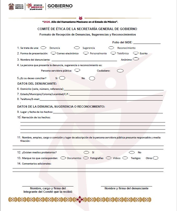 Los servidores públicos y ciudadanos en general pueden informar al Comité, de cualquier probable incumplimiento al marco normativo en esta materia, así como sugerencias para la mejora del servicio y el otorgamiento de reconocimientos, a través del Formato de Recepción de Denuncias, Sugerencias y Reconocimientos Descargar